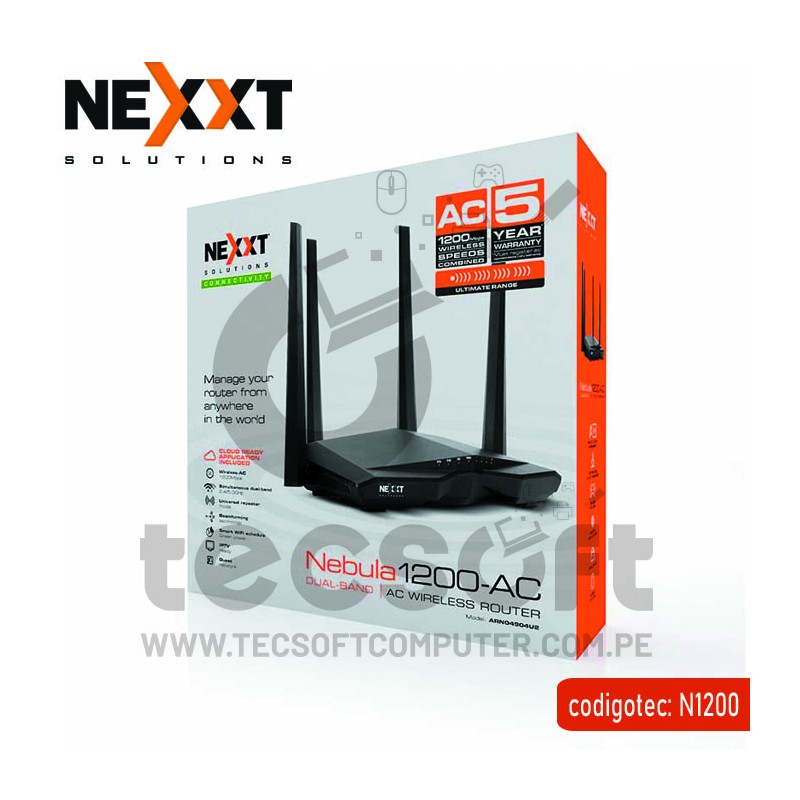 El Nebula1200-AC es la nueva generación de routers inalámbricos AC de doble banda que se incorpora a la familia de Nexxt Solutions. Velocidades de transmisión de hasta 1200Mbps, 867Mbps en la banda de 5.0GHz y 300Mbps en la de 2.4GHz, lo convierten en el dispositivo perfecto para entornos residenciales y empresariales de menor escala, en donde se utilizan múltiples dispositivos digitales en forma simultánea. La tecnología en la Nube de Nexxt, en conjunción con las aplicaciones móviles, permite vigilar el estado funcional del router en tiempo real y ejercer control sobre él en forma remota a través del teléfono inteligente, tableta o computador.
